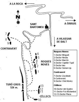 Uno de los sitios por donde se puede llegar es, llegando al pueblo de la Roca del Vallès desde Vilanova del Vallès y hay un semáforo, tienes que girar a la derecha en la carretera d'Òrrius (BV-5106), entonces continuas toda la carretera de curvas hasta que hay un cartel que pone Mas Céllecs a la derecha, entonces te metes y aparcas el coche en la Masia que hay. A partir de aquí tienes que subir un camino donde hay una cadena. Subes y la primera a la izquierda te lleva como a una trialera, sigues subiendo y cuando sales puedes ir a la izquierda que hay unos caminitos pequeños y te llevan a un sector o cojes otra trialera pequeña que sube hasta una torre de vigilancia. Antes de subir a la torre hay dos caminos, el que te lleva a la torre por la derecha o el que baja a la izquierda, se puede ir por los dos pero si vas por la izquierda te lleva a pie de via, pero hay que estar atento en el camino que hay un momento en el que hay unas piedras amontonadas que te indican la entrada.
