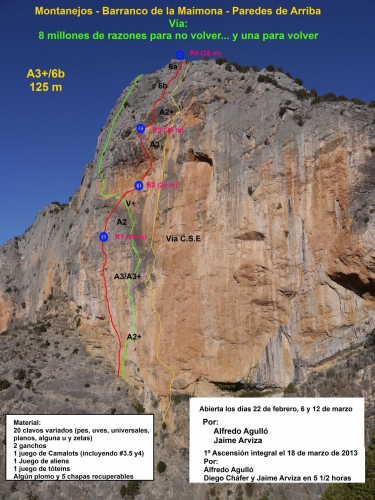 Harán falta 25 clavos, alguna falca de madera, ganchos, algún plomo, cinco recuperables, juego completo de alliens, juego complento de totems y juego completo de camalots, incluyendo el 3.5 y el 4. También en el 1, 3 y 4 largo se ha utilizado el tricam del 1.5.