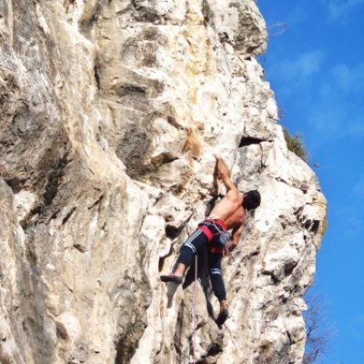 Entrada de placa tumbada, después, a mitad de vía comienza el desplome con churreras y acaba la salida con desplome pero con canto. Después del paso dura del desplome de churreras un buen reposo.