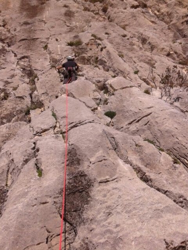 Un largo bastante mantenido que supera algunos trozos de roca naranja ligeramente desplomados. Se puede empalmar con el siguiente.