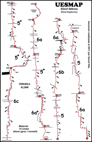 El nombre de la vía, UESMAP (siglas de Unió Excursionista Sant Martí de Provençals) está picado en la roca al inicio de la misma.