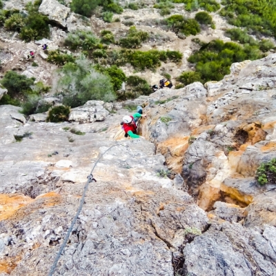 Andando. Seguir el sendero de la cima hacia la izquierda hasta alcanzar las cadenas por donde se destreza a la base de la pared
