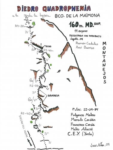 Vía reequipada con el permiso de los aperturistas. Se han sustituido los spits viejos y algunos clavos por bolts del 8 y 10 mm. Se han reequipado todas las reuniones con bolts del 10.