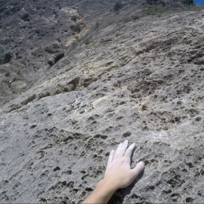 A vista | 1 | Ya bastante alto y llegando al final te encuentras el paso más difícil de la vía (y que le da el grado). Da la sensación de que estás escalando sobre una pared de gotelé >:D | |