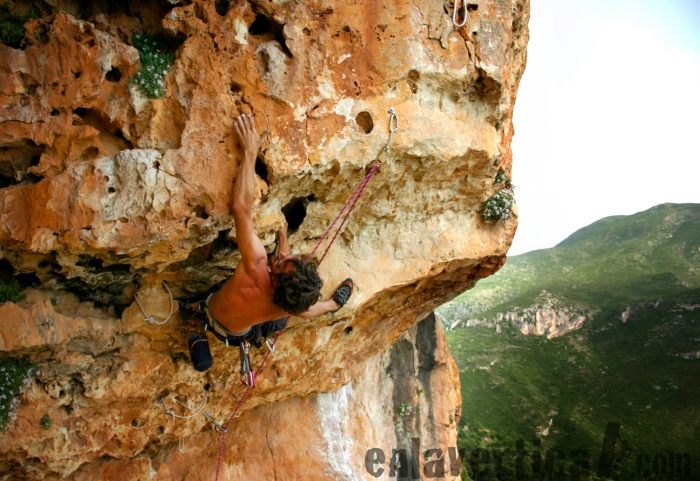Empieza por una zona algo descompuesta protegida recientemente con dos cordinos hasta situarse en una repisa con una fisura desplomada. Sigue por una placa ligeramente tumbada y acaba cruzando un impresionante desplome con mucho canto. Espectacular en su grado.