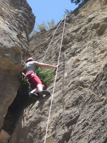 Segunda de derecha a izquierda. Llevar casco, pues sube por una chimenea. Respetar el palmito que hay a mitad de vía, es una especie protegida.
